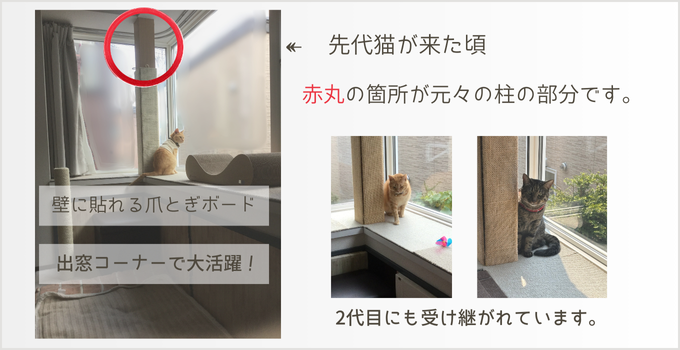 この「爪とぎボード」は、先代猫・ハーにゃんを迎え入れる際に、出窓コーナーの柱を保護する目的で用意しました。