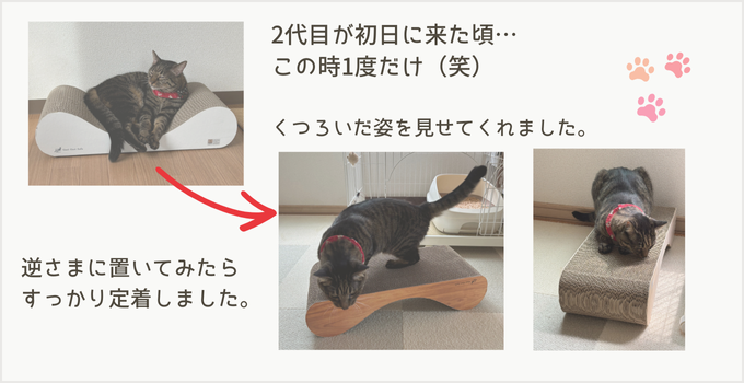 猫は気まぐれなので、突然使ってくれるようになることもあります。特に2代目は、特に狭い場所や囲まれた空間を好むため、「ガリガリサークル・シリーズ」はかなりお気に召したようです(笑)